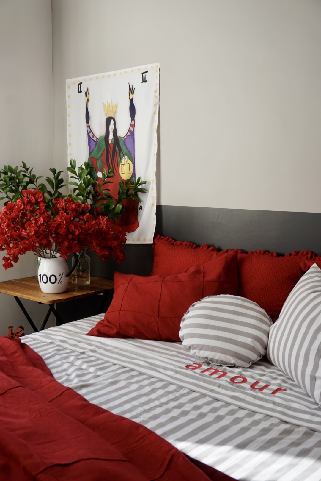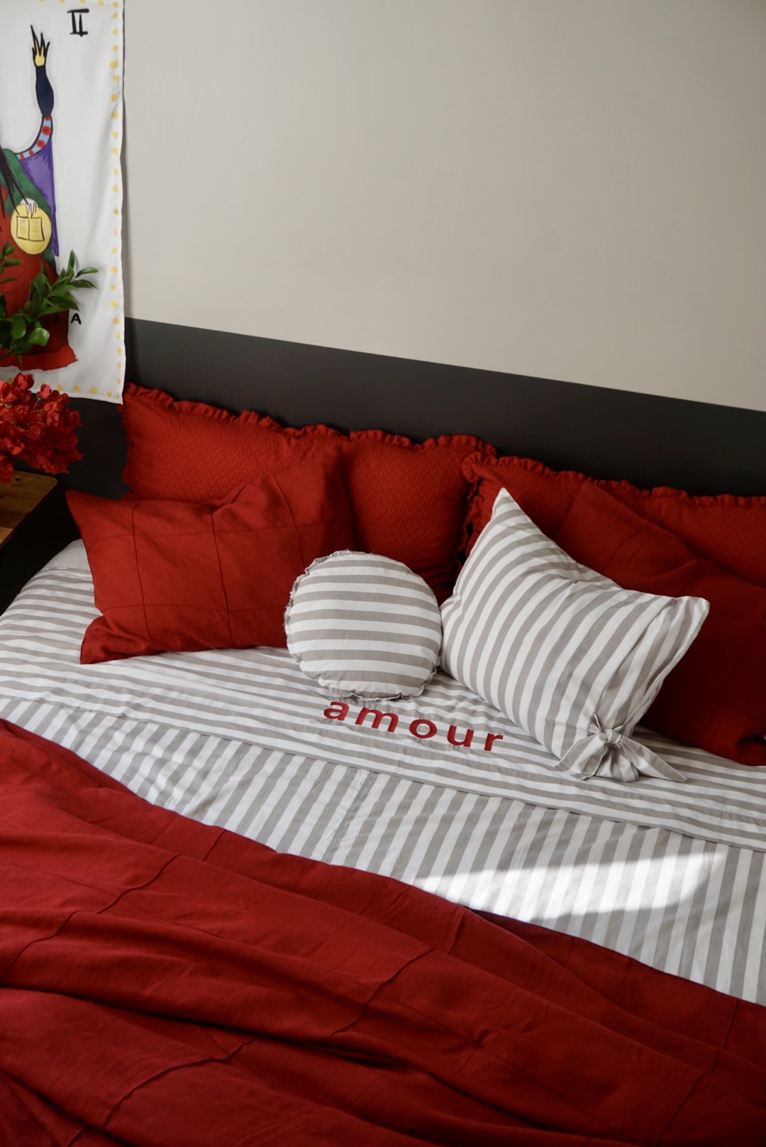 Lençol 3 peças na Listra 100% algodão bordado AMOR vermelho: