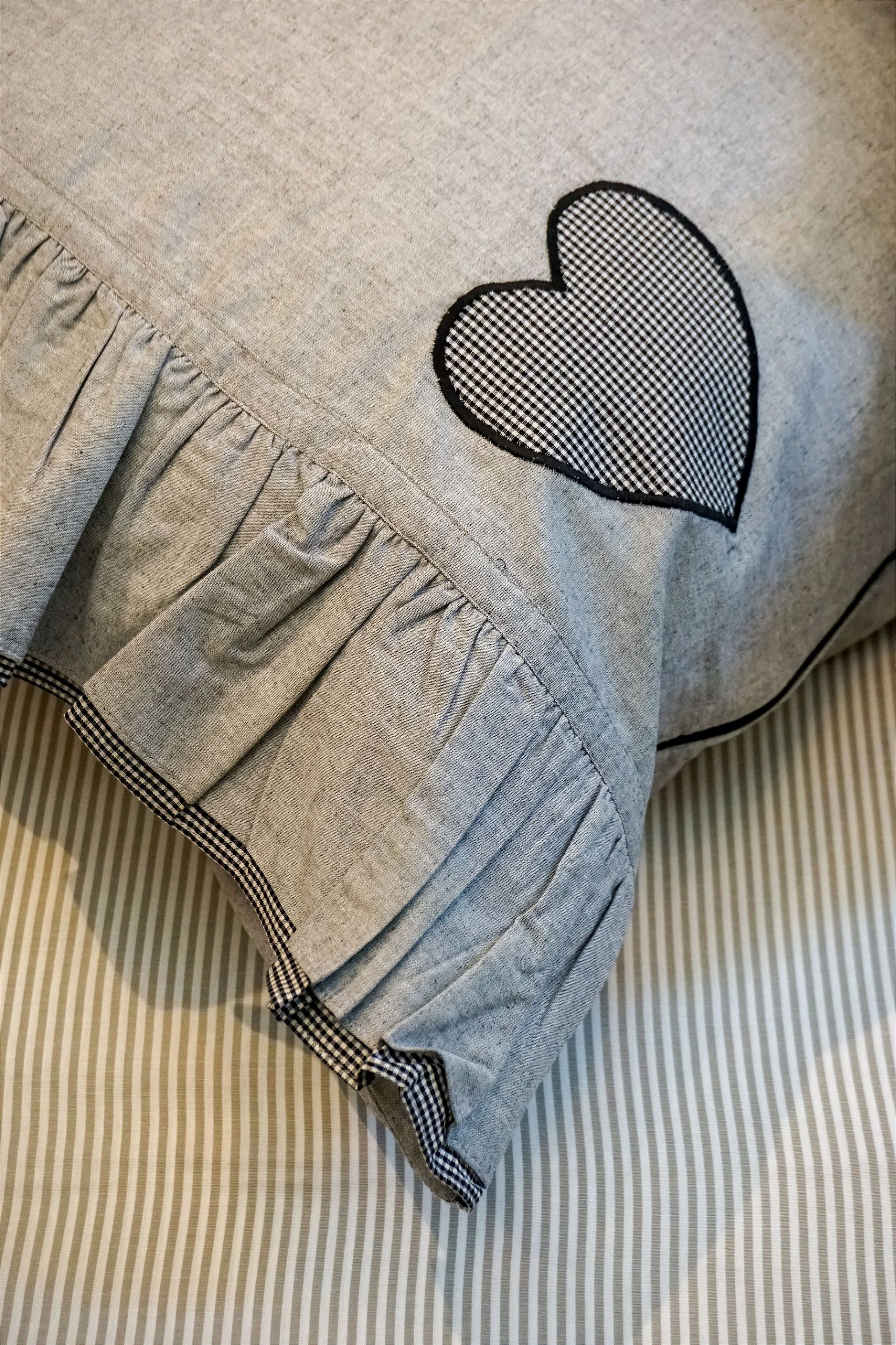 Par de porta travesseiro no mescla com babado em uma lateral e coração aplicado em xadrez grafite.